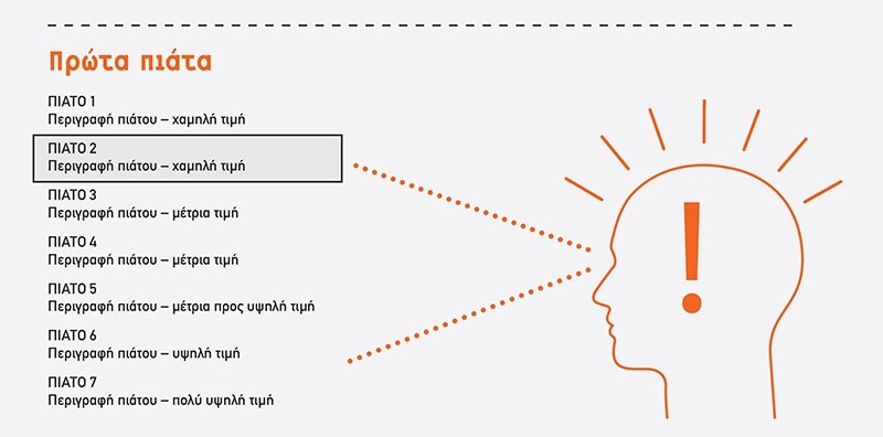 Αντίθετα, αν οι τιμές μπουν σε συνέχεια της πλήρους περιγραφής του πιάτου, η διαφορά είναι αξιοσημείωτη. Ο πελάτης πράγματι επικεντρώνεται στο πιάτο και σε δεύτερο χρόνο στην τιμή.